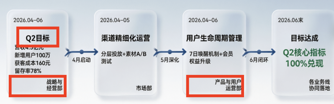 以及第四张的流程图,「Q2目标」没居中,战略与经营部和产品与运营部的部门名称写成一行会更合适,现在的断行方式让卡片的重心略微失衡: