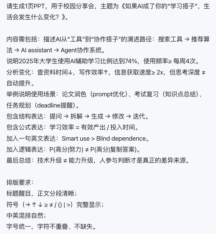 咱们这次直接上强度,让AI生成一页符号密集、中英文混排、公式穿插的PPT内容,以下为提示词: