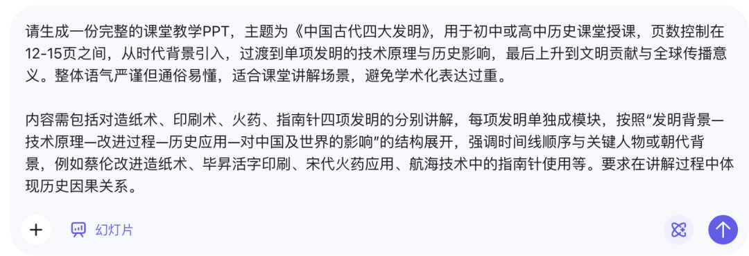 为了更直观地对比简单提示词和复杂提示词下模型的语义理解能力,这次我们用同一个案例进行测试——让AI做四大发明的课件PPT。