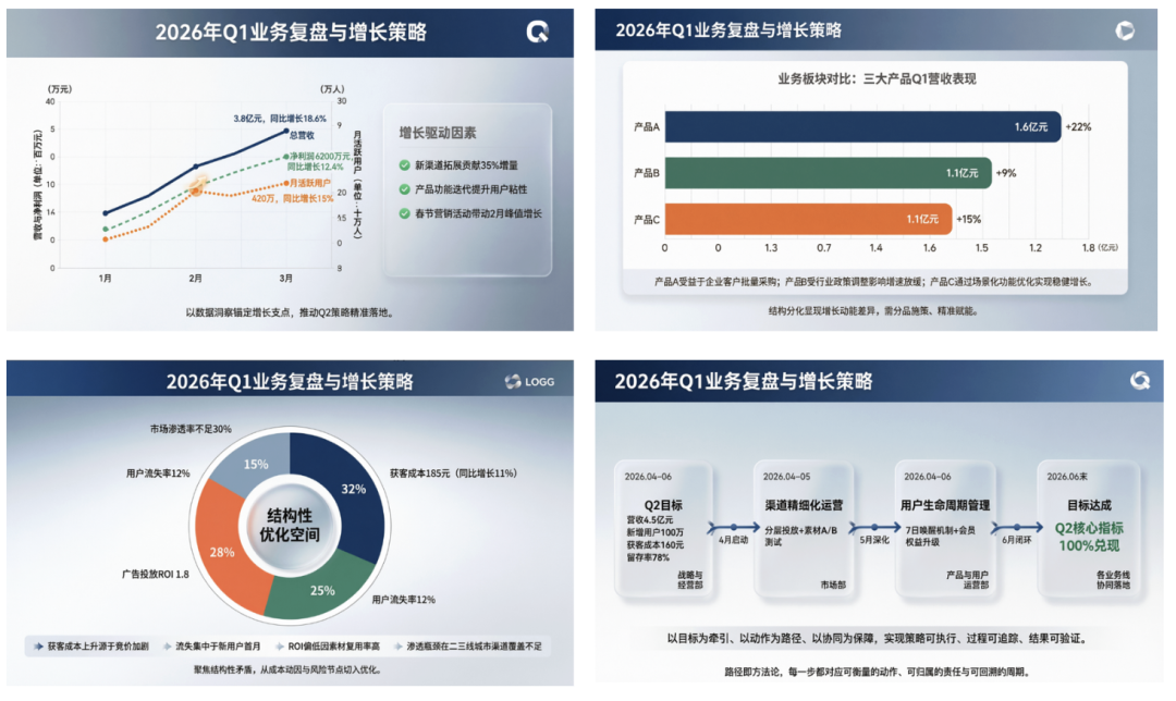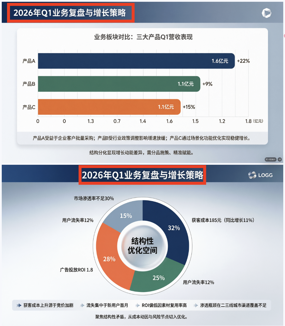 业务复盘与增长策略报告,数据多、逻辑重、信息密度高,最考验排版和层级: