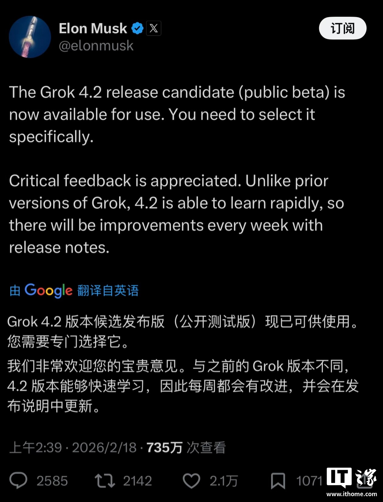 IT之家 2 月 18 日消息,今日特斯拉、X 平台 CEO 埃隆 · 马斯克通过 X 平台发文官宣,xAI 旗下大模型 Grok 的 4.2 版本候选发布版(公开测试版)现已可供使用。