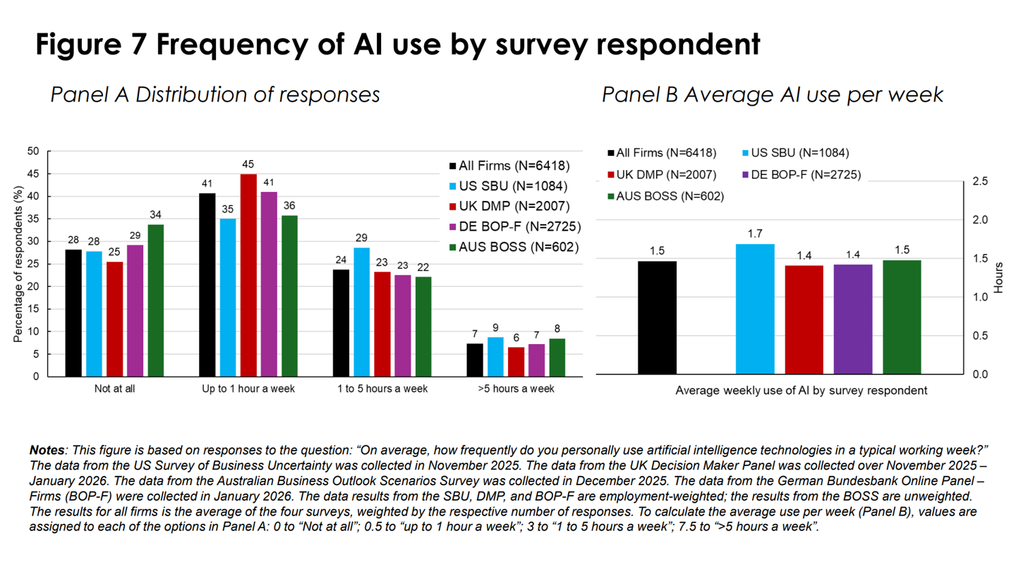 IT之家援引博文介绍,虽然约三分之二的高管声称在使用 AI,但实际平均使用时间仅为每周 1.5 小时,甚至有 25% 的受访者完全未在工作中使用 AI。