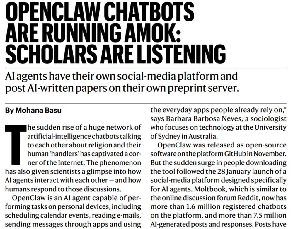 今天(2026年2月19日)发表的国际顶刊《自然》(Nature),专门用一篇深度报道的内容,拆解了这个现象。下面我们就从科学认知的角度,聊透这个核心问题,也帮大家看清网上诸多夸大宣传背后,关于AI智能体最真实的现状与逻辑。