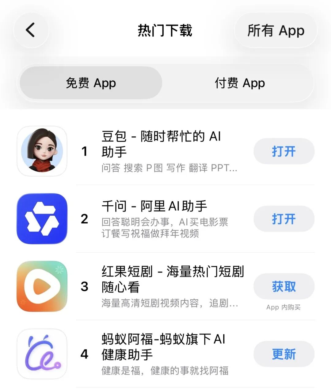 在用不完的AI新品、抢不完的AI红包中,互联网用户注意力空前分散,又空前聚焦。他们在千问、豆包、元宝等通用AI助手之间来回跳转。如果没有例外,春节期间苹果App Store应用下载榜前五名几乎要被通用AI助手包揽。