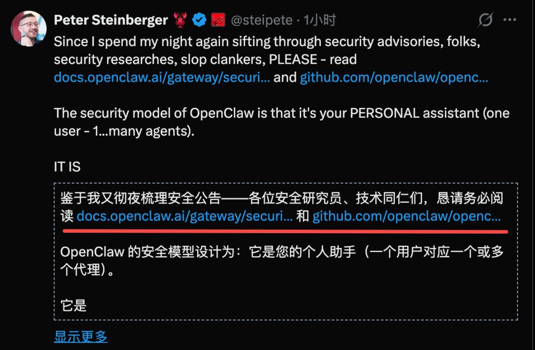 然后他立马更新了安全公告,并希望所有人在玩OpenClaw之前要仔细阅读。