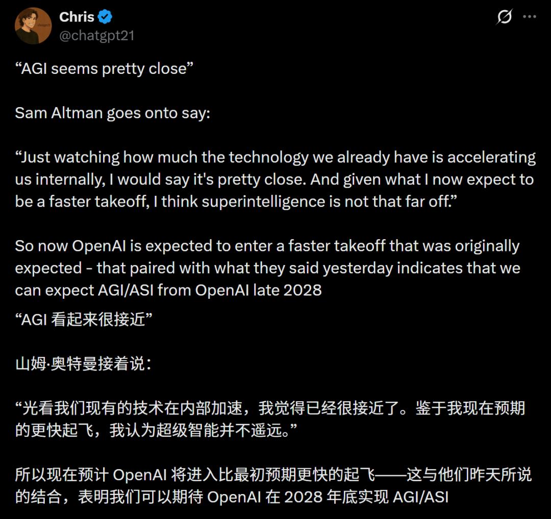 他再次强调:我们可以期待,OpenAI在2028年底实现AGI/ASI。