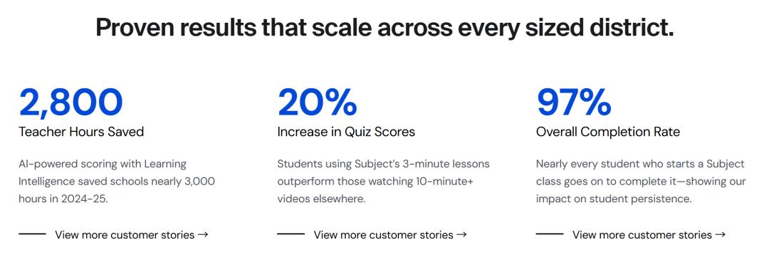 据统计,2024-2025 学年,Subject 的 AI 驱动评分功能为合作学区节省了大量教师工作时间,有效缓解了师资短缺的压力,同时使用其短时课程的学生,测验成绩也显著优于使用其他平台同类课程的学生,充分体现了其产品价值。
