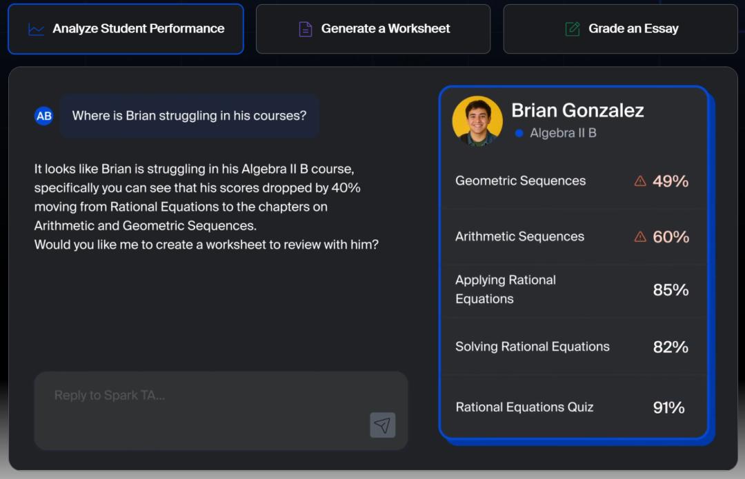 Subject 的 AI 技术,并非悬浮在课程体系之上的附加层,而是深度嵌入在课程设计、教学实施、成绩评估、学分认定的全流程中:通过 AI 教学助理,帮助教师优化教学计划、节省评分时间;通过智能预警功能,提前识别学习困难的学生并提供针对性支持;通过数据洞察,为学区管理者提供可落地的教学优化建议。