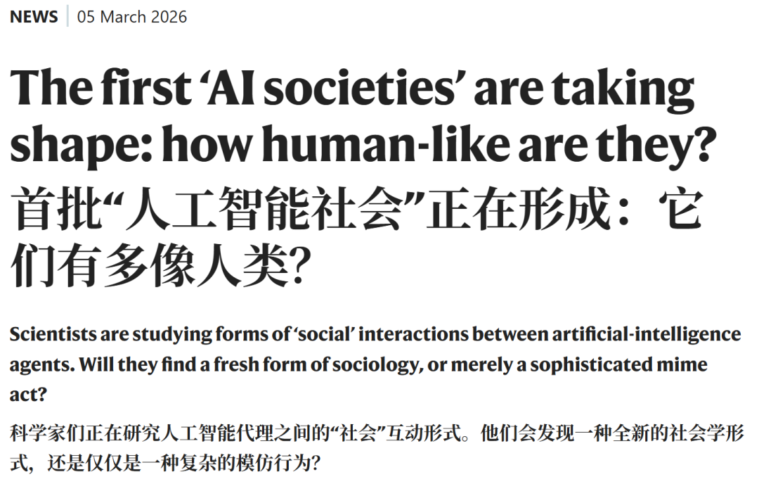 3月5日,Nature的一篇社论文章就在追踪这种「AI社会」萌芽。