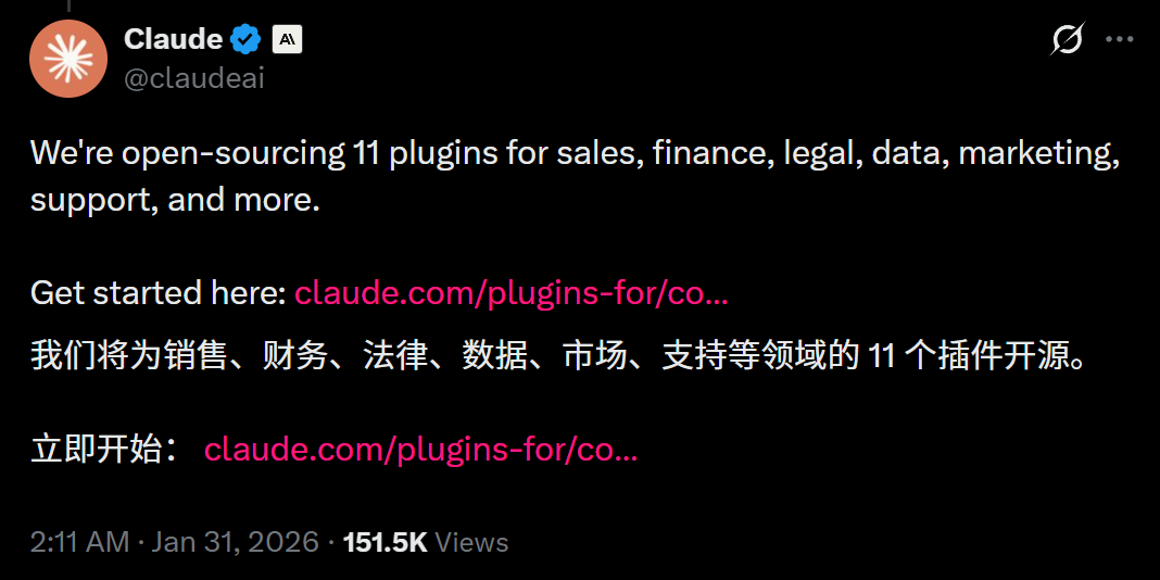 2026年1月29日,Anthropic为Claude Cowork新增了11款插件。