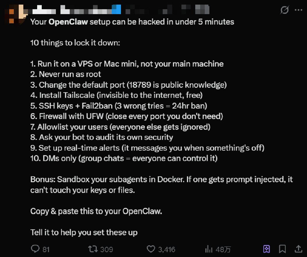 中国信息通信研究院副院长魏亮也在接受央视采访时给出六点建议,包括使用官方最新版本、严格控制互联网暴露面、坚持最小权限原则、谨慎使用技能市场、防范社会工程学攻击和浏览器劫持、建立长效防护机制等等。