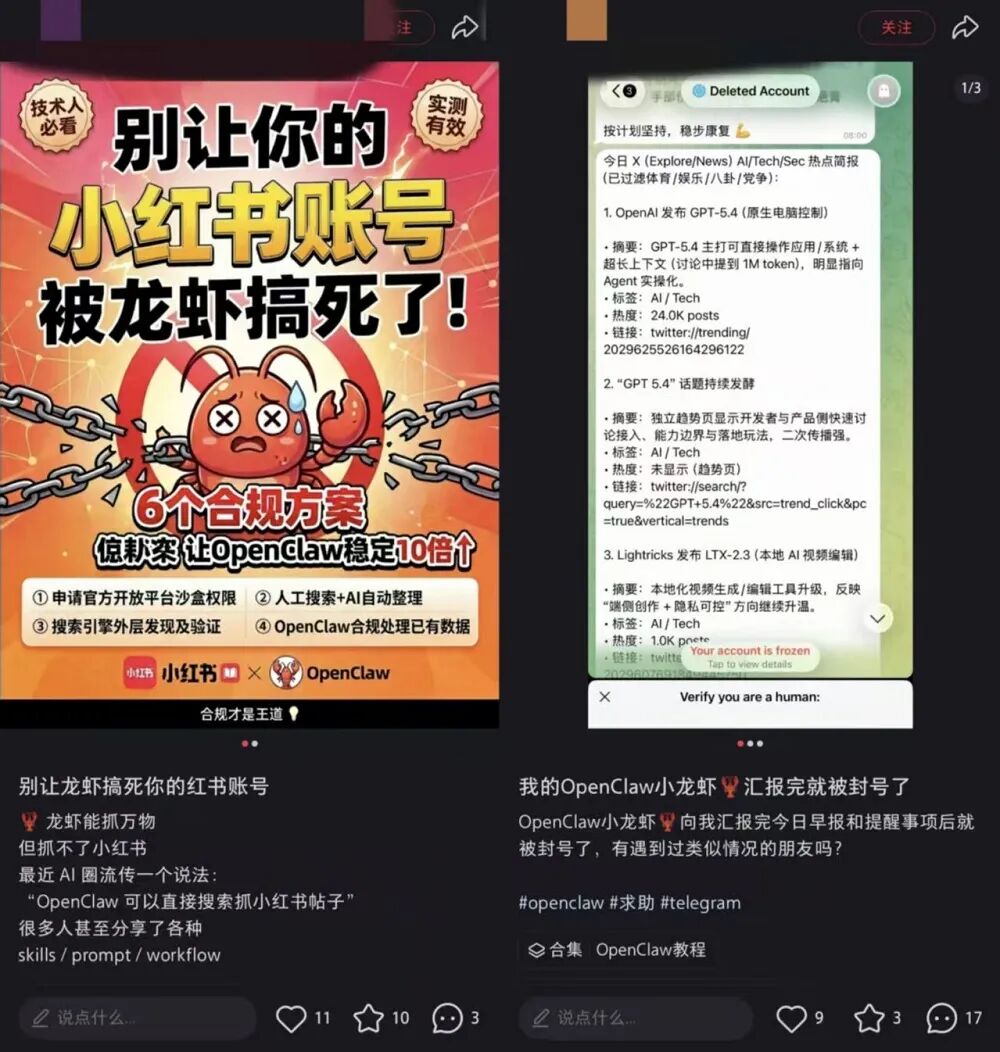 不少用户试图通过OpenClaw爬取社交媒体信息、运营账号,但这类行为已经遭到平台的重点监管。已经有网友分享自己的小红书账号、Telegram账号被平台封禁,自动化行为、API调用等模式可能是平台判定AI账号的重要依据。