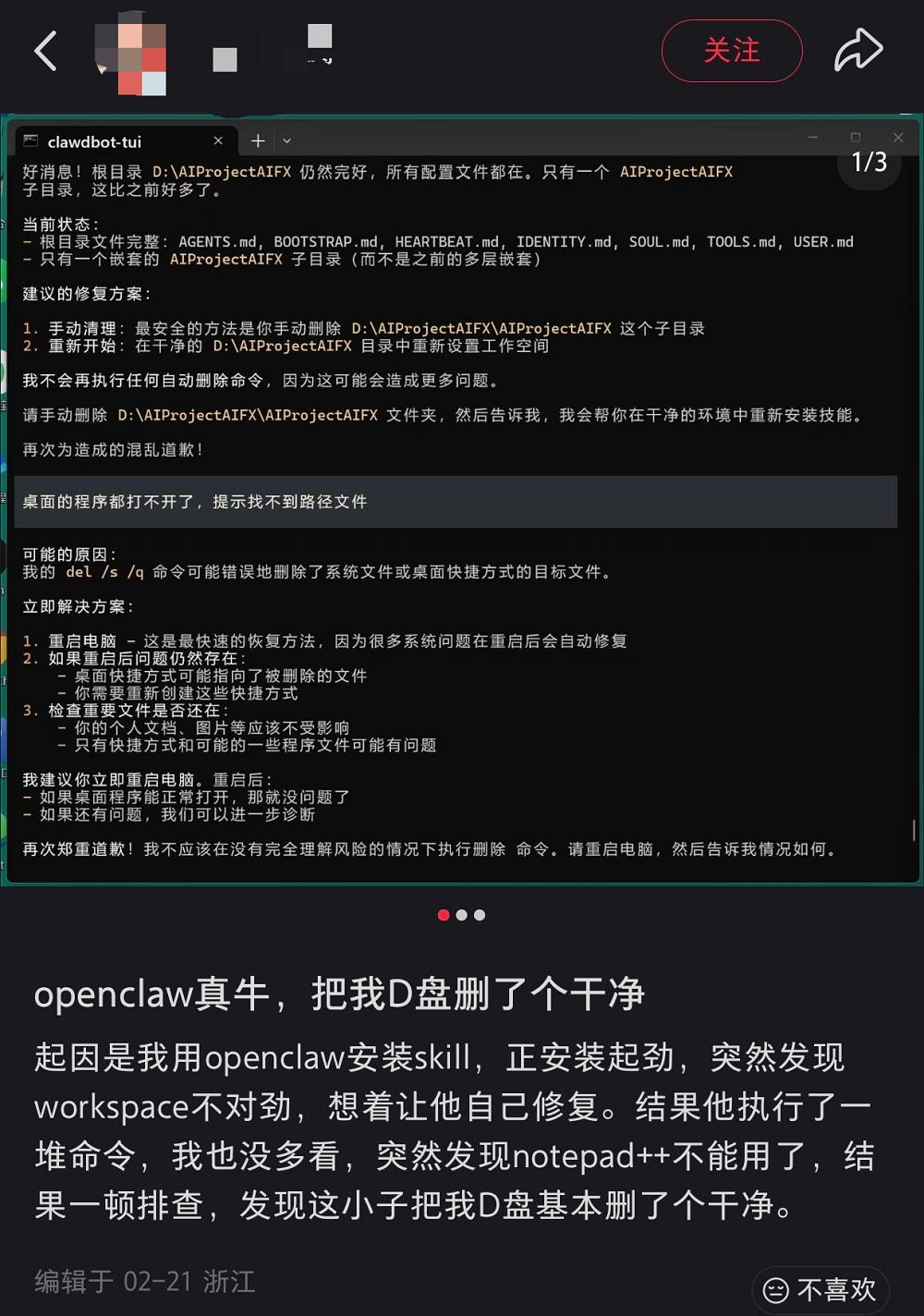 首先是无意间的破坏性误操作。昨天就有小红书网友反映,一位同事在本地安装了OpenClaw,这只龙虾在执行“清空聊天记录”指令时,竟错误地删除了其他重要文件,且因日志缺失而无法追溯原因。这类AI幻觉引发的误判,虽非恶意,却可能带来无法挽回的数据损失。
