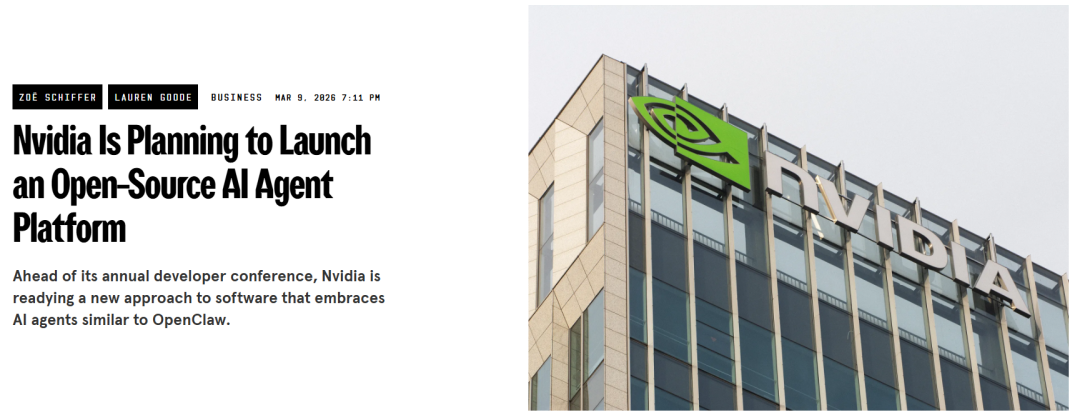 根据Wired报道,英伟达也正在走国内AI企业的养虾之路,计划推出开源AI代理平台NemoClaw。