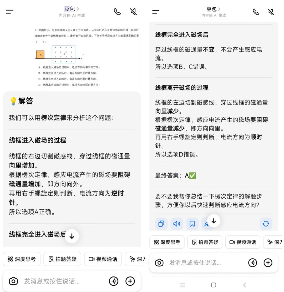 高中生月亮,则把豆包看作全天候在线的家教老师。他喜欢用豆包拍照解题的功能,把自己不懂的数理化问题上传,豆包每次都能给出正确答案,并附上完整的解题步骤。针对其中不懂的小细节,他会用语音通话的形式向豆包询问,并在一轮又一轮的对话中,彻底掌握相关知识点。