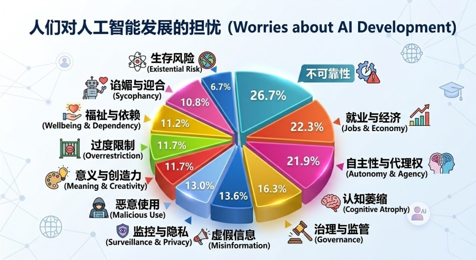● 反馈与生存:10%的人忧虑AI只会一味迎合奉承,而6%的人则关注更深层的存在性风险。