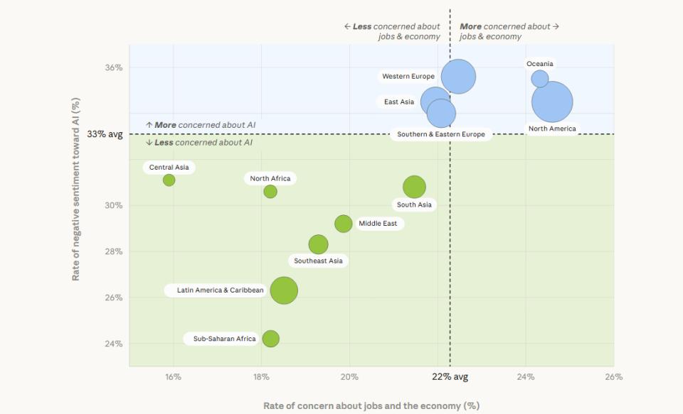人们对AI的态度,很大程度上取决于对就业和经济的担忧程度。越富裕的地区,这种担忧越强,对AI的负面情绪也越高;欠发达地区则恰恰相反