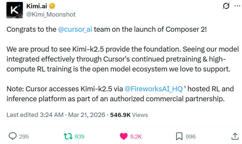 3月21日凌晨3点左右,Kimi官方账号在X平台发布声明:“祝贺Cursor团队发布Composer 2。我们很自豪看到Kimi K2.5提供了基础。看到我们的模型通过Cursor的持续预训练和高算力强化学习被有效整合,这正是我们乐于支持的开源模型生态。”