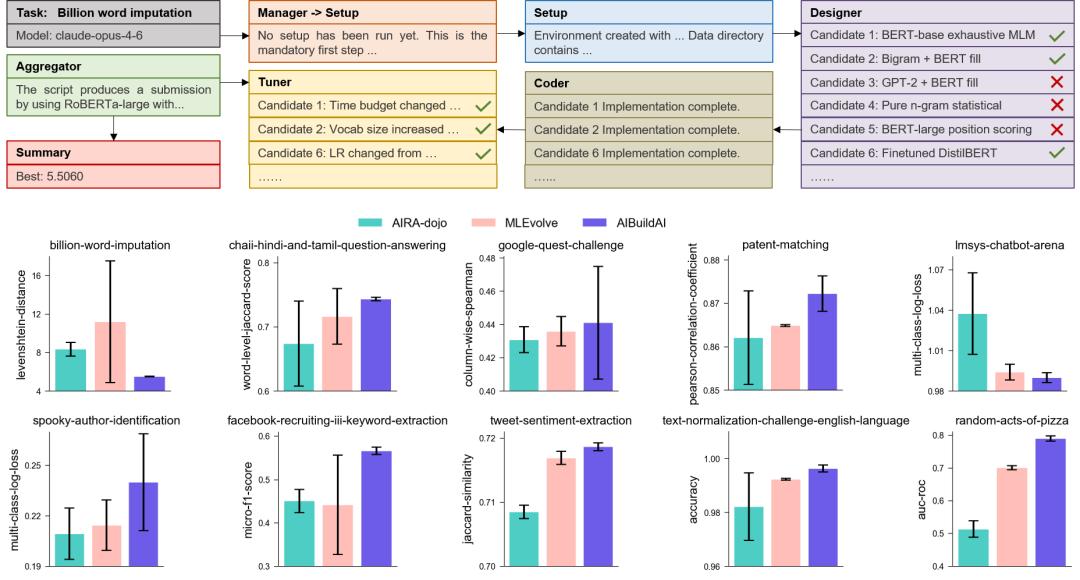 上图展示了AIBuildAI 在语言理解与生成任务上的详细结果。上半部分以Billion Word Imputation为例,完整呈现了 AIBuildAI 各智能体的运行轨迹:Manager依次调度Setup、Designer(提出6个候选方案)、Coder(实现流水线)和 Tuner(迭代调参),最终Aggregator以RoBERTa-large为基础生成提交文件,取得5.5060的最优分数。下半部分对比了AIBuildAI与AIRA-dojo、MLEvolve在10个具体语言任务上的性能表现。