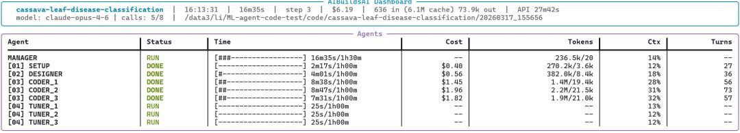 不同于以往将代码生成作为核心范式的单体系统,AIBuildAI显示建模了训练动态监控、早停机制与超参数调整等关键环节,更贴近真实工程师团队的工作方式。