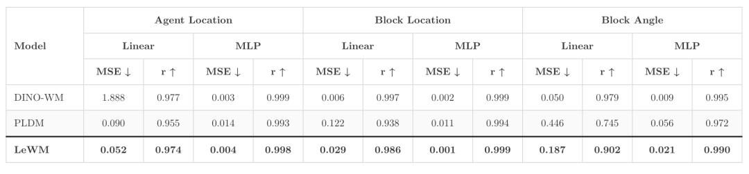 模型把画面变成一串数字(latent),团队在训练好的LeWM后面,接入一个简单的小探测器,让它只靠latent数字,去预测机器人/方块的位置、方块的角度、机械臂指尖坐标。
