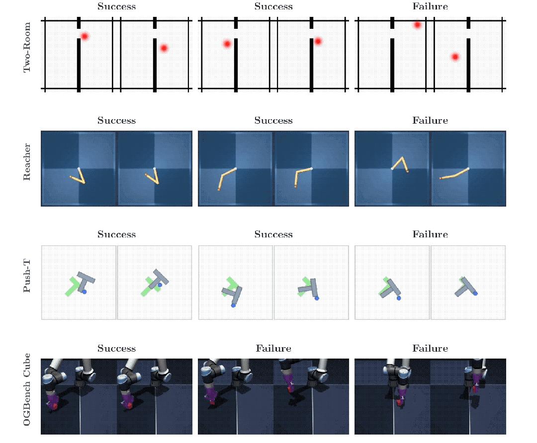 4个任务分别是Push-T(推箱子)、Reacher(机械臂够目标)、OGBench-Cube(3D 机械臂抓方块)、Two-Room(2D 导航)。