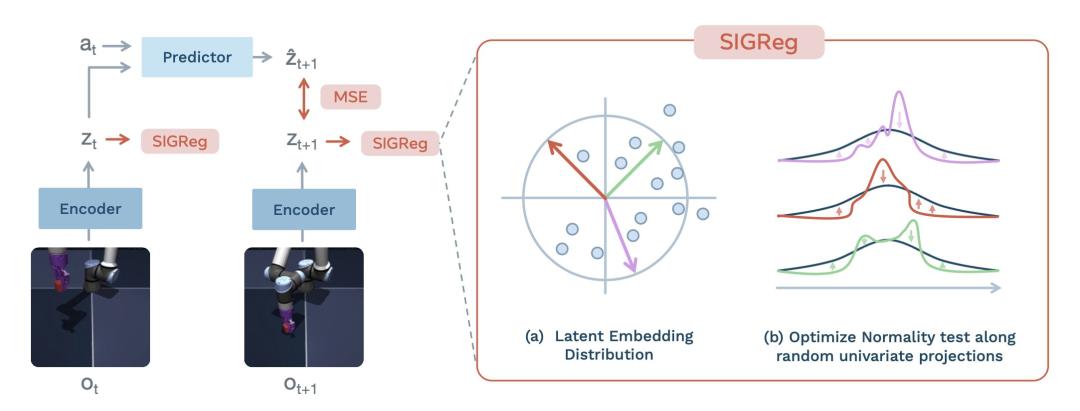 SIGReg正则损失:强制让所有特征向量服从标准高斯分布。作用是防止模型 “摆烂坍塌”(所有画面输出一样的特征)。
