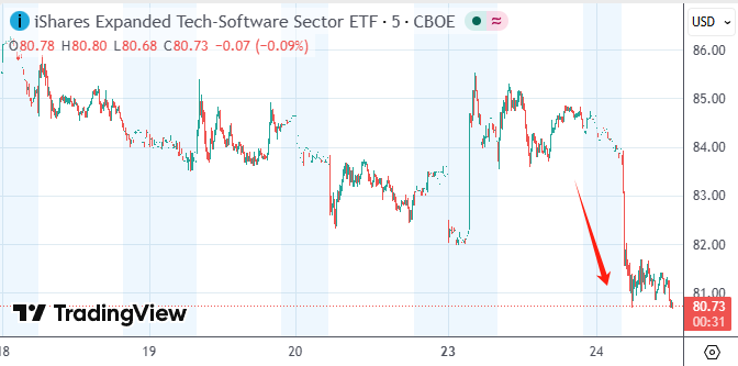 截至发稿,iShares扩展科技软件行业ETF(IGV)跌超4.3%。UiPath和HubSpot股价跌超8%,Palantir和SAP跌超4%,微软和谷歌C也跌超近3%。