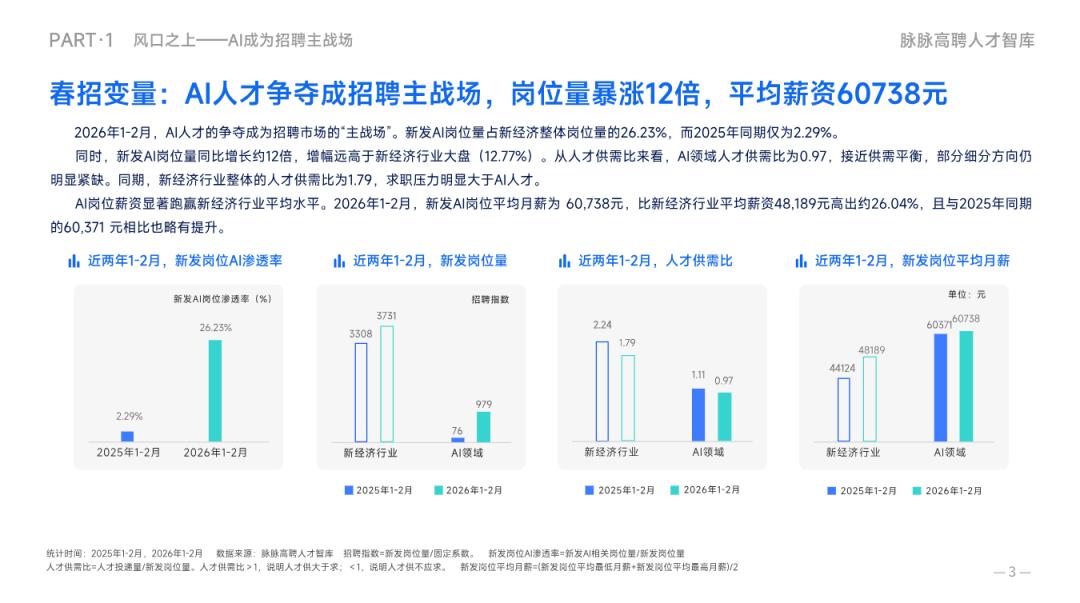 这现状大体符合脉脉在本月初发布的人才招聘报告。该报告称在2026年的1-2月,AI岗位数量同比增长了约12倍,在全部新经济岗位中的占比也从去年的2.29%上升至26.23%。