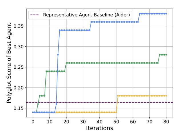 在Polyglot基准中,Python任务上的自我改进同样提升了Rust、C++、Go等不同语言任务的表现。