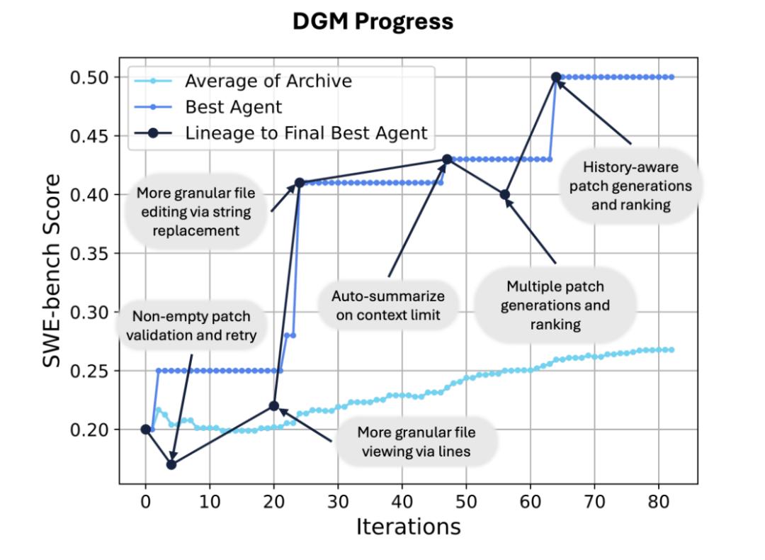 在SWE-bench上,DGM自动将其性能从20.0%提升至50.0%。