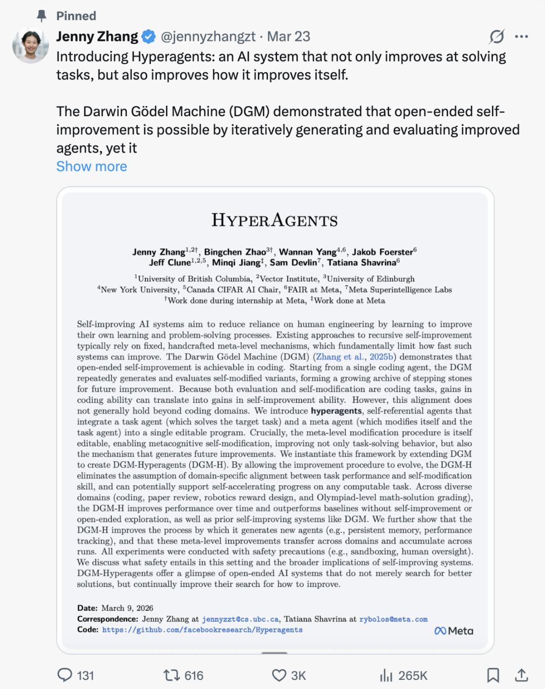 参考链接[1]https://arxiv.org/pdf/2603.19461[2]https://sakana.ai/dgm/[3]https://x.com/jennyzhangzt