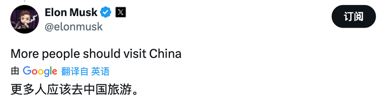 回到开头,马斯克那条“More people should visit China”,当然不是空洞的旅游建议。