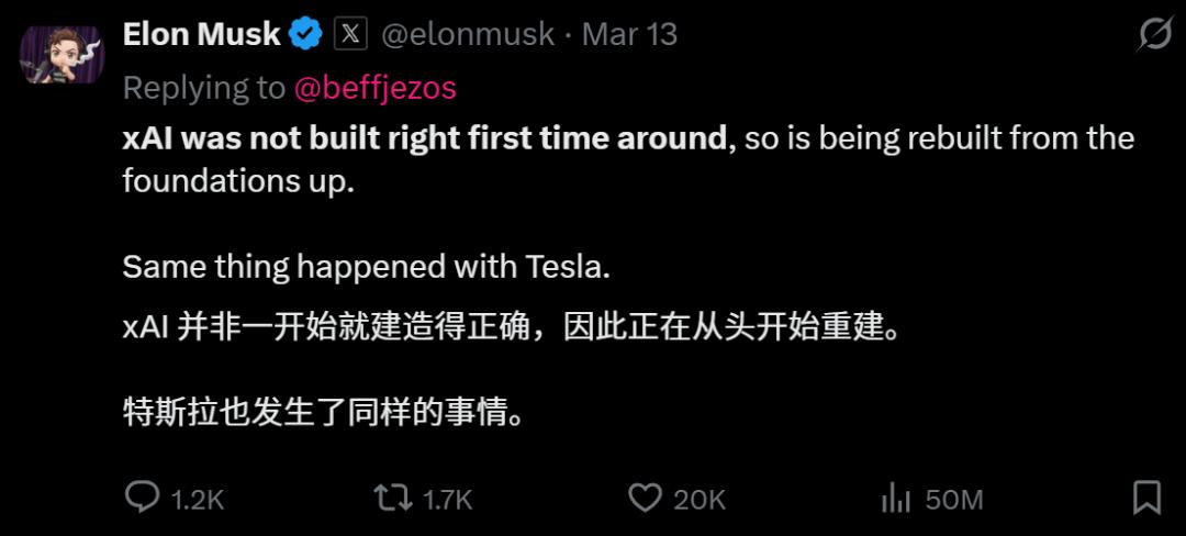 3月13日,也就是最后几位创始人离职前夕,马斯克在X上发了一条极其罕见的坦白声明:「xAI was not built right first time around, so is being rebuilt from the foundations up。」(xAI第一次没搭对,所以正在从地基开始重建。)