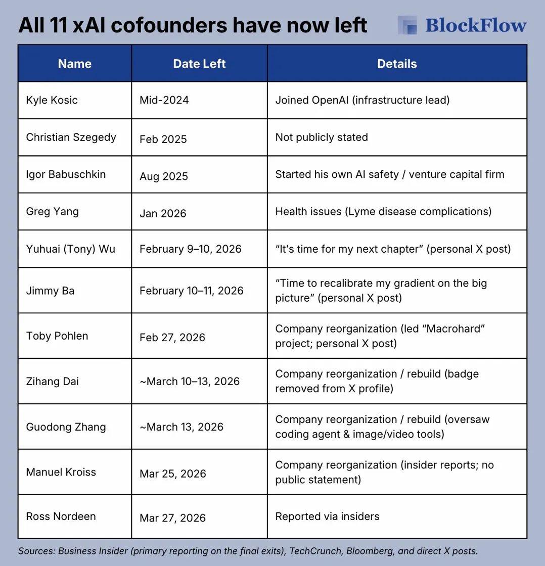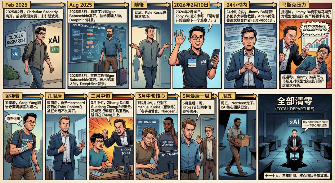 他的离开,意味着一个冰冷的事实:2023年马斯克亲手拉起的xAI创始天团——11位联合创始人——到2026年3月底,全部出清,一个不剩。