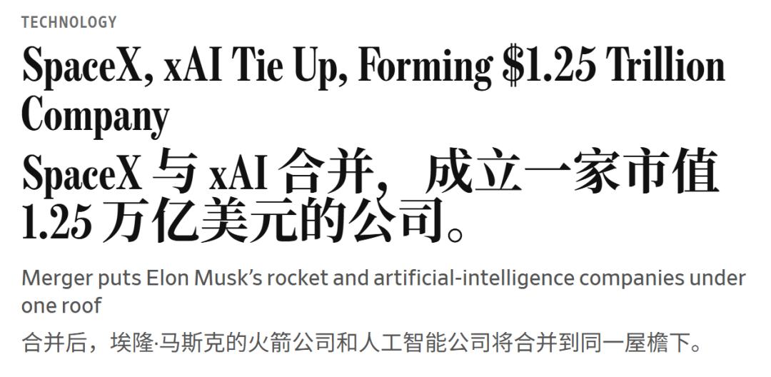 2026年2月2日,SpaceX以全股票交易的方式收购了xAI,SpaceX估值1万亿美元,xAI估值2500亿美元,合并后实体价值1.25万亿美元,创下有史以来最大企业并购估值纪录。