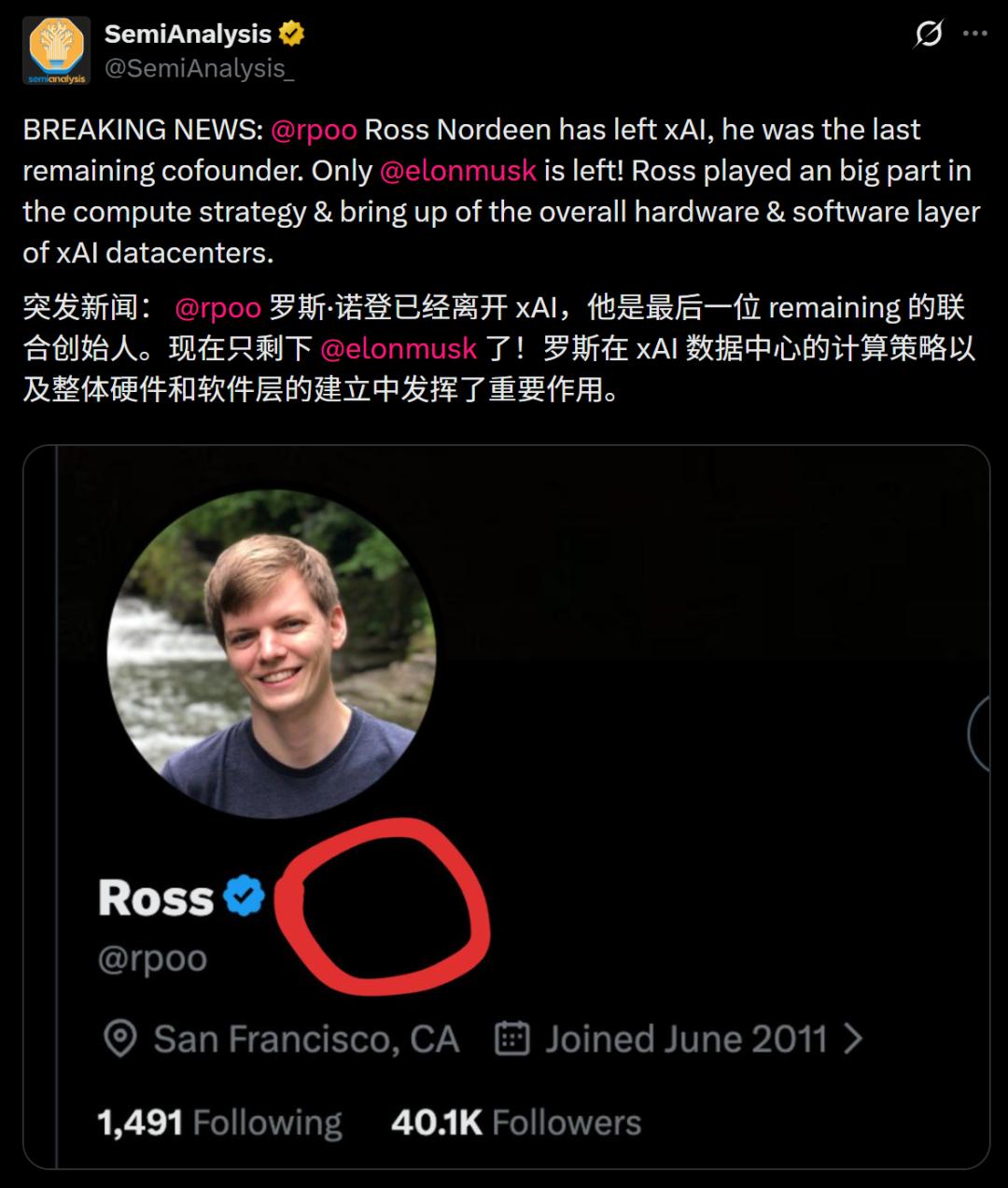 因为Ross Nordeen不是普通员工——他是xAI除马斯克以外,最后一位留守的联合创始人。