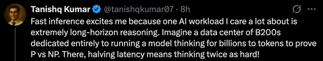Tanishq Kumar 称:「我对快速推理感到兴奋,因为我非常关注的一个人工智能工作负载是超长时域推理。想象一下,一个拥有大量 B200 的数据中心完全用于运行一个模型,该模型需要处理数十亿个 token 来证明 P 与 NP 的区别。在这种情况下,延迟减半就意味着可以进行双倍深度的思考!」