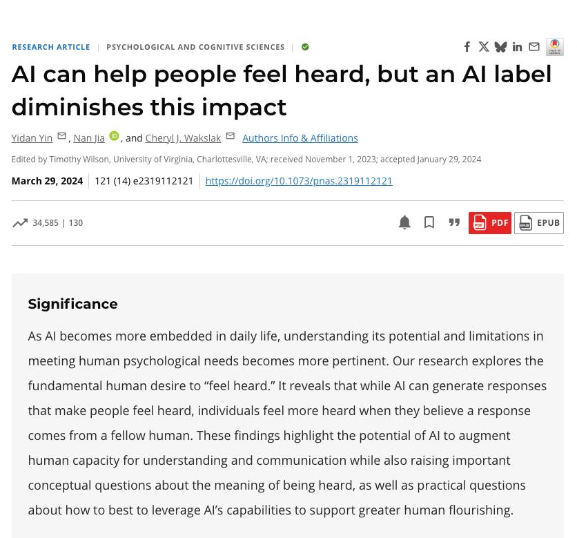 发表在《美国国家科学院院刊》(PNAS)上的一项研究发现,AI 生成的安慰消息,竟然比真人写的更让接收者感到「被倾听」。AI 在提供情感支持时更稳定、更周全,不会像真人那样因为紧张而说错话,因为尴尬而回避问题,或因为赶时间而敷衍了事。