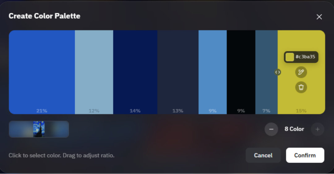 除了推荐的色彩,你也可以自己在调色盘里调整这 8 种色彩,比如小编自己调了一套色彩,调色的时候,你可以选择颜色的色号、色彩占比。