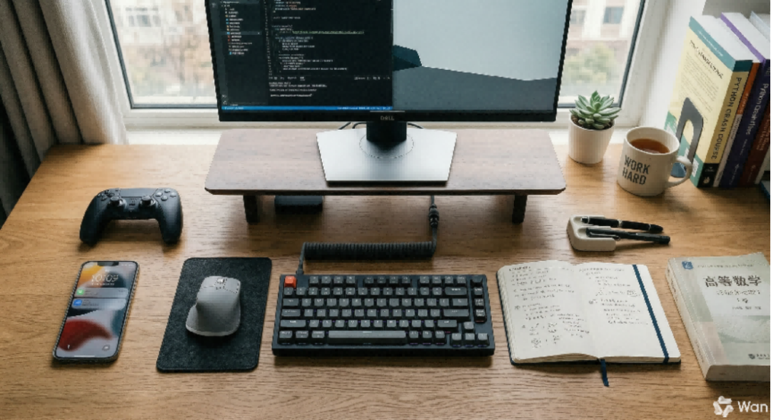 Wan2.7-Image 原生搭载的交互式编辑功能,就解决了这个痛点。在体验过程中,小编上传一张有序摆放各种物品的办公桌的照片。