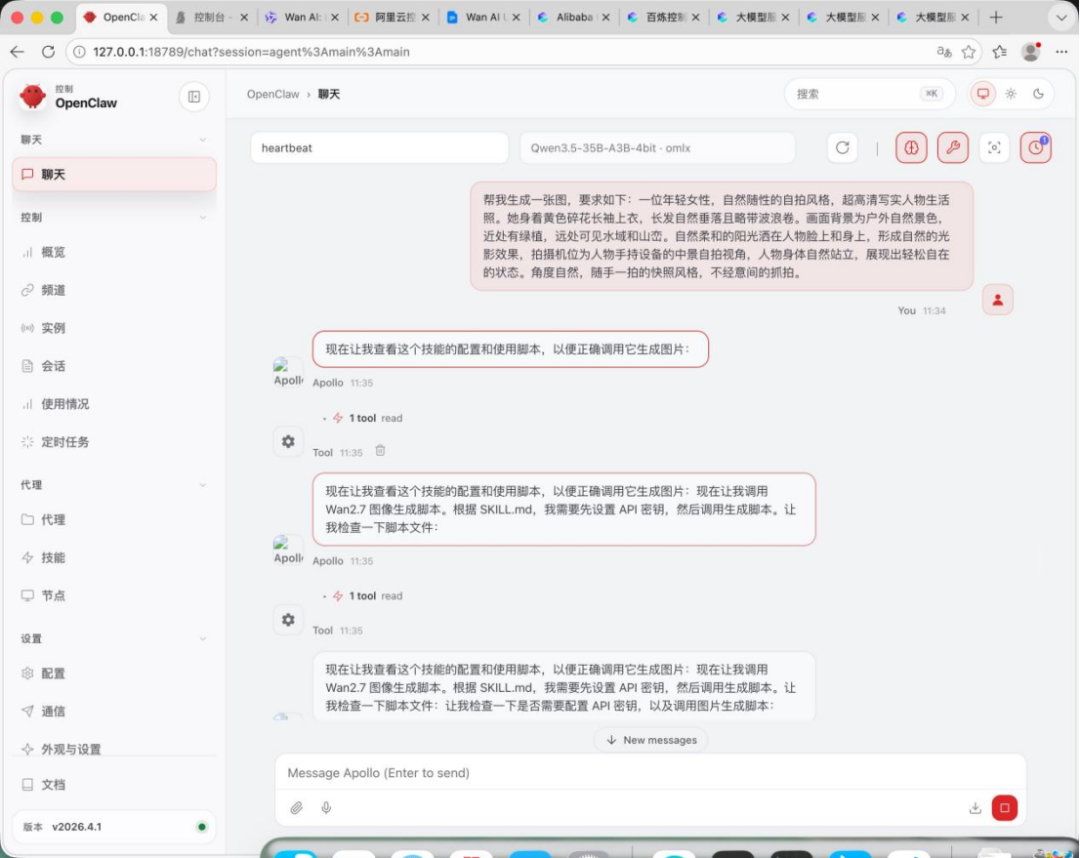 然后就可以用龙虾开启你的对话生图体验,比如小编在测试时让它生成了一个年轻女性的照片,龙虾很快就帮我完成了图像的生成。