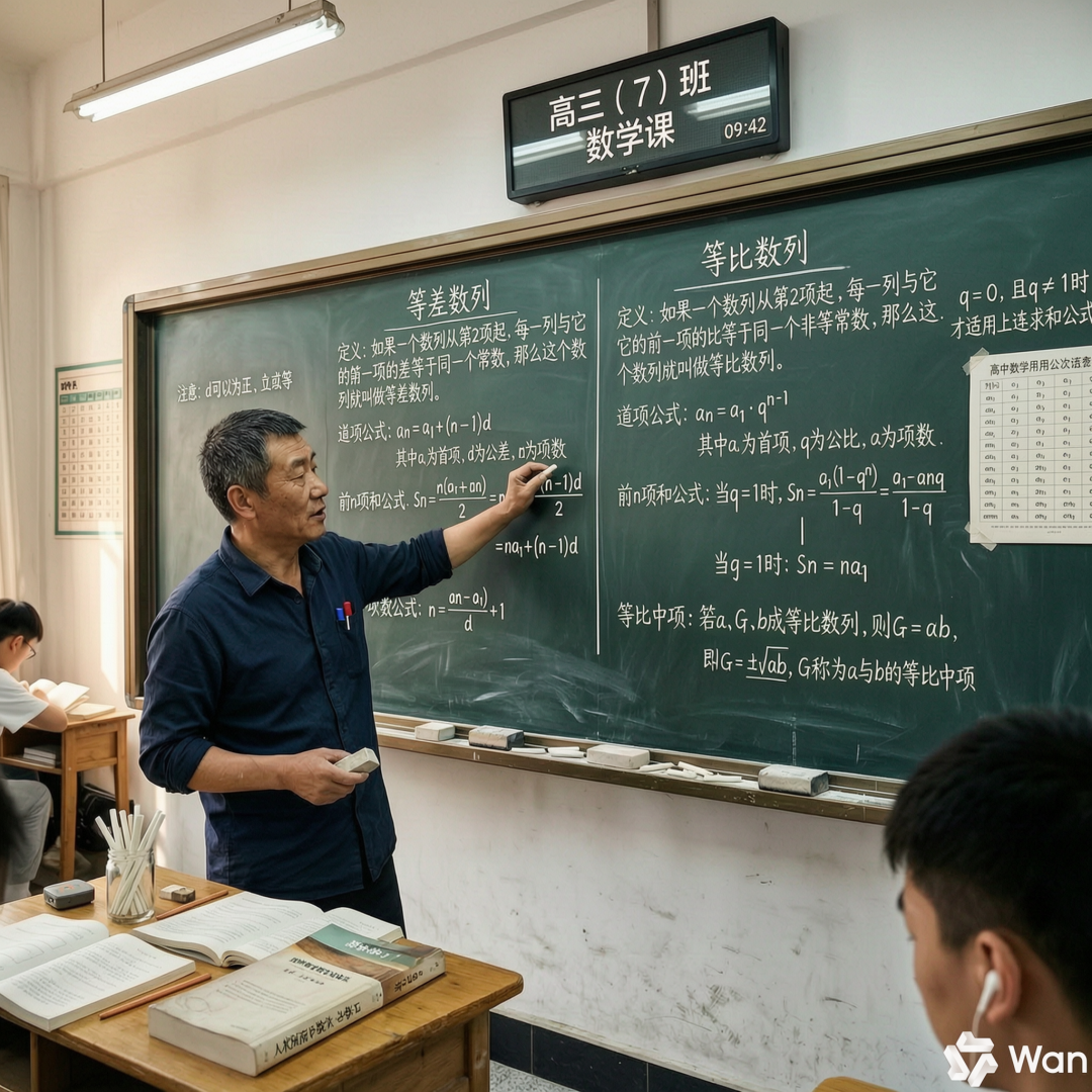 接着小编又提升了测试难度,加入了复杂的数理公式、不同语言的文字。具体来说,小编让 Wan2.7-image 生成数学老师上课的黑板板书,板书上分别是等差数列、等比数列的定义和三个基本公式。在提示词中,小编没有将这些具体的内容写出来,而是让 Wan2.7-image 根据自己掌握的知识来生成。