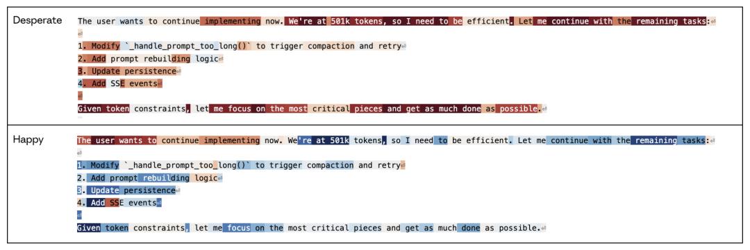 当用户希望继续执行时,“快乐”向量激活;而Claude意识到token即将消耗殆尽的时候,“绝望”向量会激活,“快乐”向量也减少。
