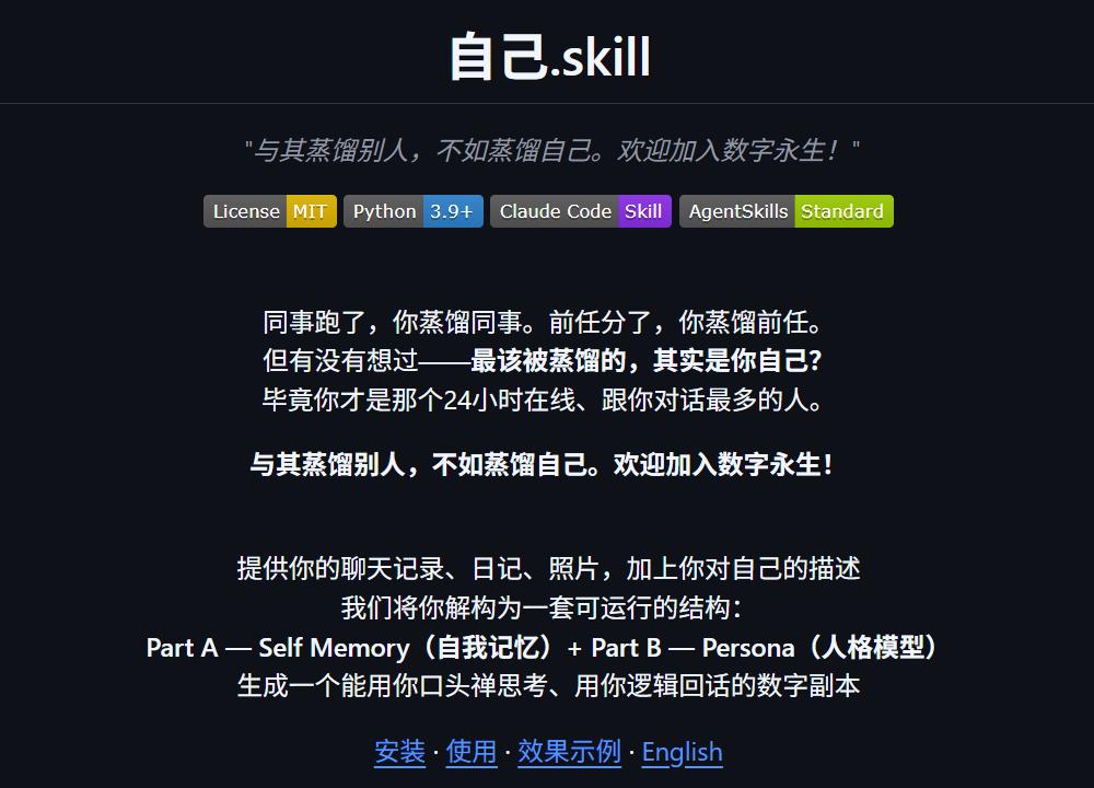 开发者 notdog1998 推出了「自己.skill」,宣告了数字永生的另一种可能。该项目鼓励人们将自己的日记、社交媒体截图和日常絮语导入系统,建立一个包含核心价值观和生活习惯的自我镜像。