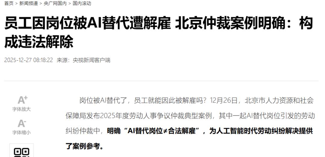 职场人们惊觉,自己多年积累的方法论正在面临被系统轻易窃取的风险。此前,北京市人力资源和社会保障局曾发布过一则具有风向标意义的仲裁案例。该案例明确判定企业因岗位被 AI 替代而直接解雇员工属于违法行为,指出这是将技术迭代的风险恶意转嫁给劳动者。