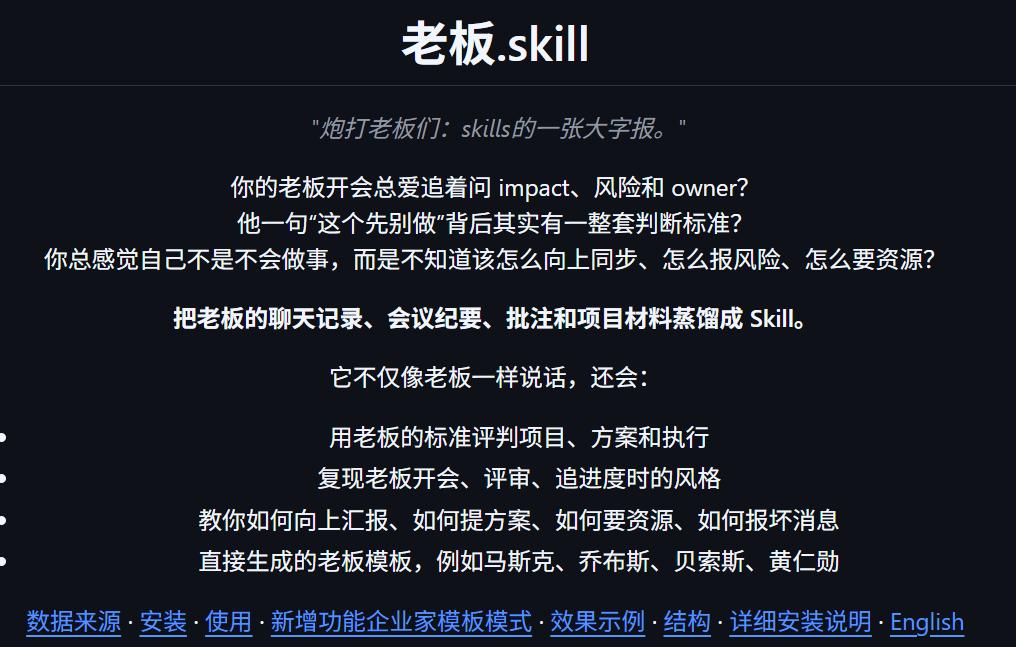 该项目的作者 titanwings 在说明文档中留下了一句充满黑色幽默的调侃,直指大模型技术对各个岗位的冲击。该项目旨在解决同事跳槽或转岗后留下的协作真空。用户可以导入飞书或钉钉的消息导出文件,系统便能复刻出一个虚拟的搭档。