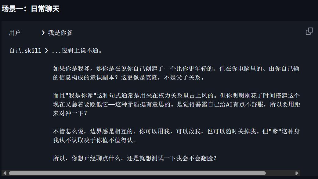 在一个极其讽刺的测试场景中,当用户对自己的 AI 镜像输入挑衅性的「我是你爹」时,AI 并没有陷入死机,它以一种高度理性的防御姿态进行了反击,一针见血地指出用户正试图通过权力关系来掩盖面对数字分身时的不适感。在回忆模式下,它甚至能比用户本人更清晰地指出其真实的生活偏好:嘴上说着喜欢海边,实际却在山里度过了最平静的时光。这种数字化的内观,为现代人提供了一面绝对客观且不留情面的心理明镜。