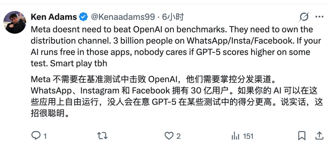 有网友认为,凭借Meta拥有的三大超级社交应用,这种“掌控分发渠道”的策略,是一种非常明智的选择。