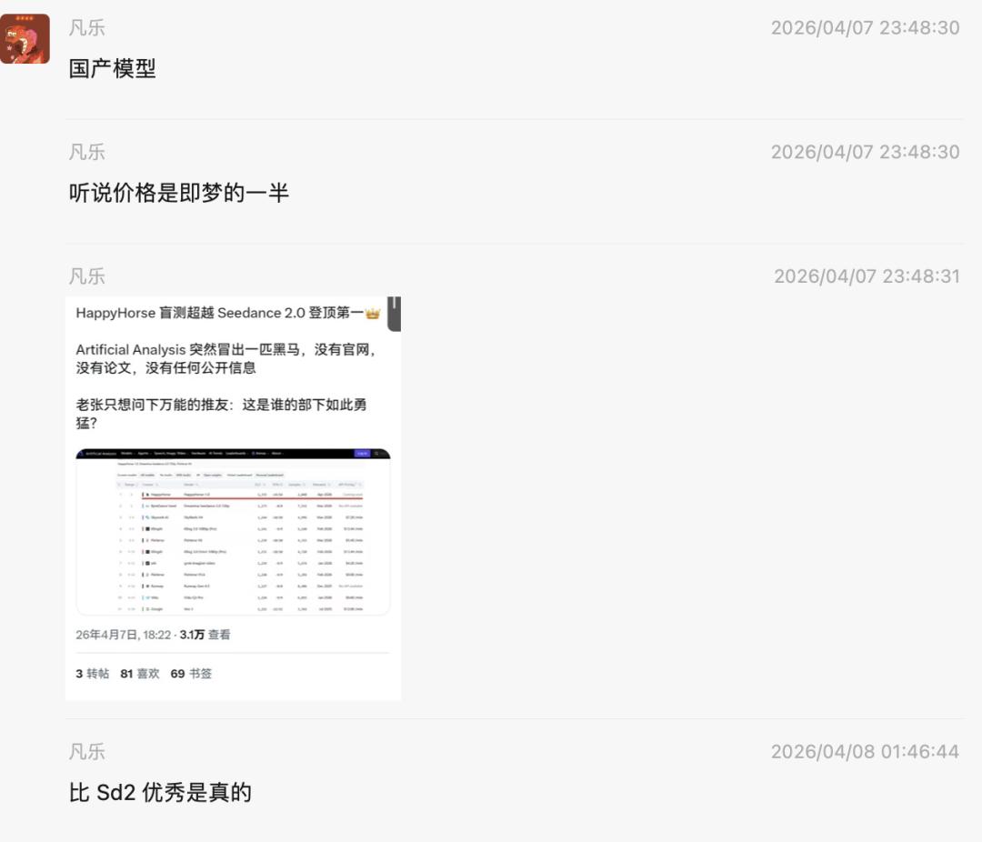 虽然关于HappyHorse的大多数的讨论都是自然发生的,但种种迹象表明,从故意隐藏信息制造讨论话题,到扔出折叠的聊天记录曝光,引起讨论,这完全可能是一场人为的,精心设计的传播。